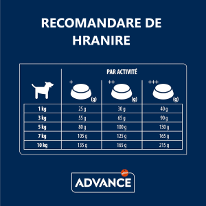 Cantitatile pot varia in functie de varsta, nivelul de activitate si conditiile de mediu. Asigurati intotdeauna apa proaspata la discretie si oferiti zilnic miscare pentru mentinerea unei conditii fizice optime.