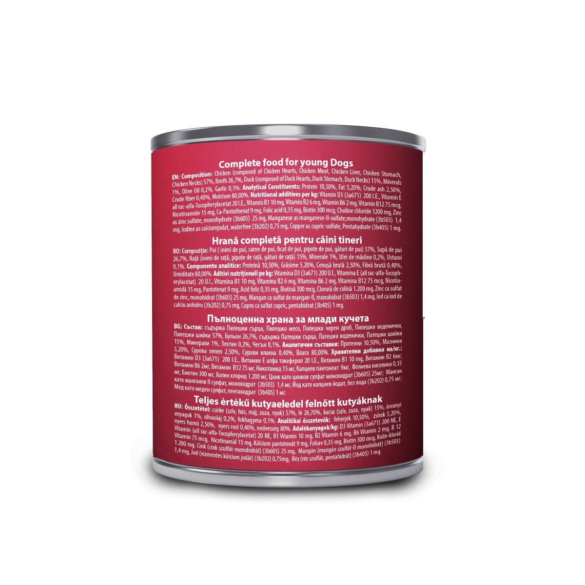 Compoziție: pui (inimi de pui, carne de pui, ficat de pui, pipote de pui, gâturi de pui) 57%, supă de pui 26,7%, rață (inimi de rață, pipote de rață, gâturi de rață) 15%, minerale 1 %, ulei de măsline 0,2%, usturoi 0,1%.