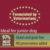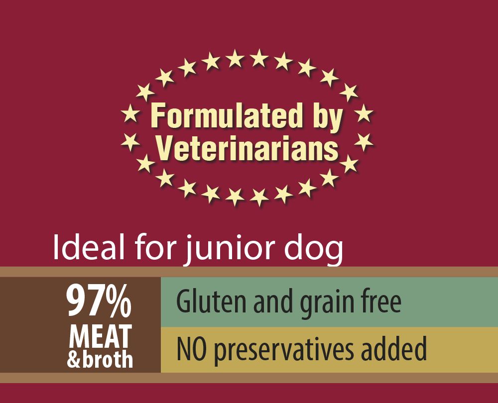 Compoziție: Vițel (inimă de vițel, carne de vițel, ficat de vițel, plămân de vițel) 70%, supă de vițel 27%, coacăze negre 2%, minerale 1%.