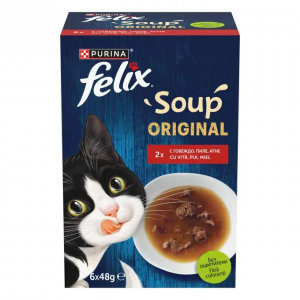 FELIX® Soup este o gama irezistibila de gustari pentru pisici, cu bucatele apetisante intr-o supa delicioasa, realizata din retete suculente, special create pentru pisicile pline de energie.