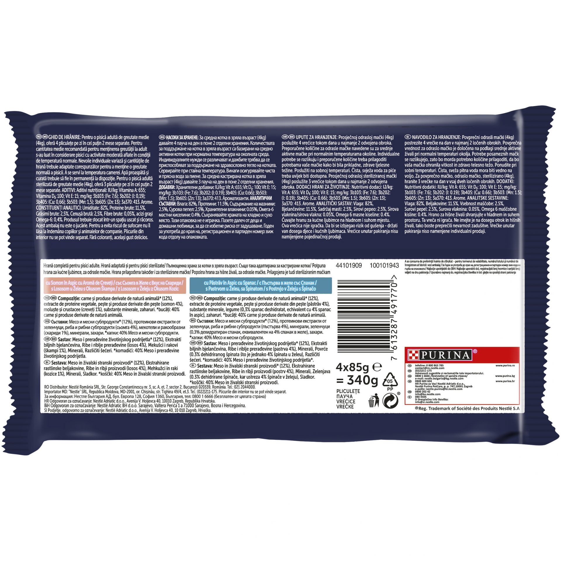 Felix Sensations pachet Mix ofera o selectie rafinata de retete cu peste, special concepute pentru a satisface gusturile pisicilor adulte. Pachetul include combinatii savuroase cu somon, creveti si pastrav, servite in aspic delicat cu spanac, pentru mese variate si apetisante.