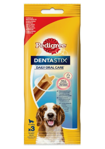 Pedigree Dentastix este o recompensa special conceputa pentru mentinerea igienei orale a cainilor de talie medie. Datorita texturii speciale si formei unice in X, aceste batoane dentare ajuta la curatarea dintilor si la mentinerea gingiilor sanatoase, oferind in acelasi timp o gustare delicioasa.